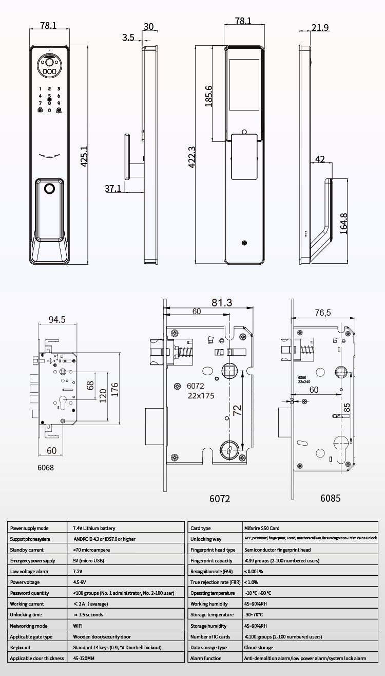 APP,Password, fingerprint, IC card, mechanical key , ekey, face FingerprintMaterial: