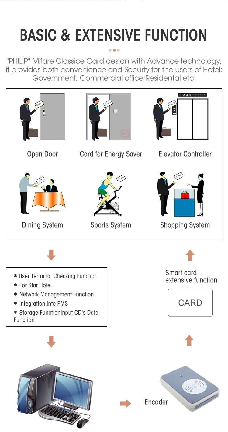 9. Management classification: support 14 types of cards including authorization card, clock card, room number setting card, master card, emergency card, floor card, building card, guest card, temporary card, house keeping card, alarm card, no-disturbing card etc